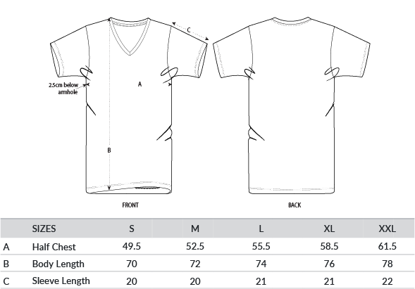 Set-in sleeve. self-fabric at neck collar. Inside back neck tape in self-fabric. Sleeve hem and bottom hem with narrow double topstitch. Men's, medium fit, short sleeve, v-neck. 100% organic ringspun combed cotton. Single Jersey. Fabric washed. Vegan certified. Fairwear Foundation certified. Oeko-Tex certified.