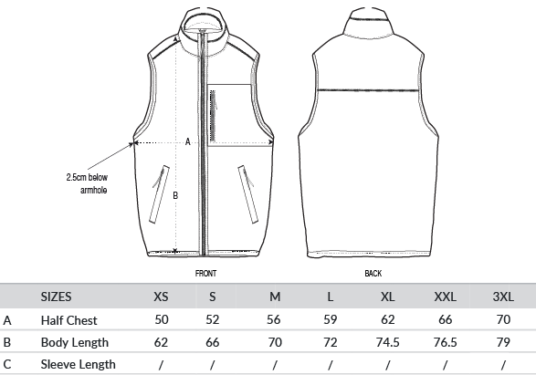 Sleeveless. Elastic recycled binding at cuffs and hem. Inside back neck binding loop and back neck tape. Plastic Vislon zip with metal zip pull and cord ends. Fully bonded inside polar fleece layer with anti-pilling finish. Front side contrast softshell welt pockets with hidden zip closure. Contrast softshell fabric at pocket, back yoke and outer collar band. Inside invisible zip at the wearer’s left chest for easy decoration.
